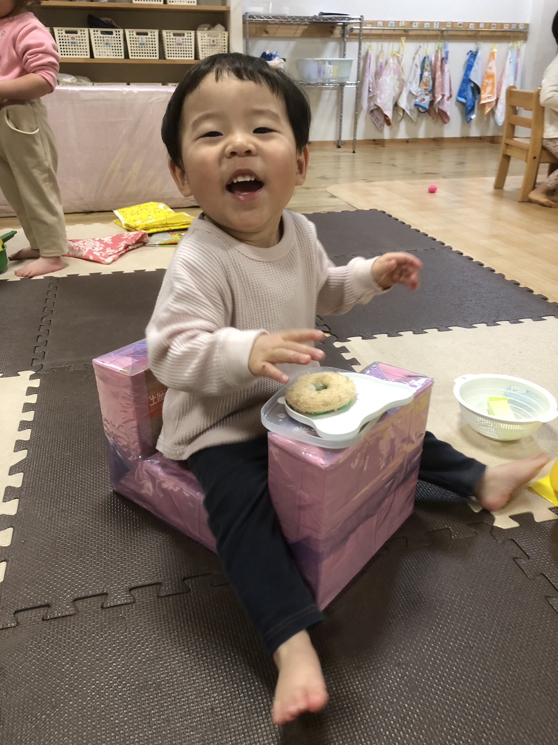今日はお部屋での様子をお伝えします。 これは夏ごろに、うずらの先生が作ってくれた物。 最初はままごとの机でしたが、今はいろいろな使い方をしています。 料理を配達中。 電車のトンネル。 乗っておでかけ。おやつも持ったよ。「ばいばーい」 洗濯ばさ...