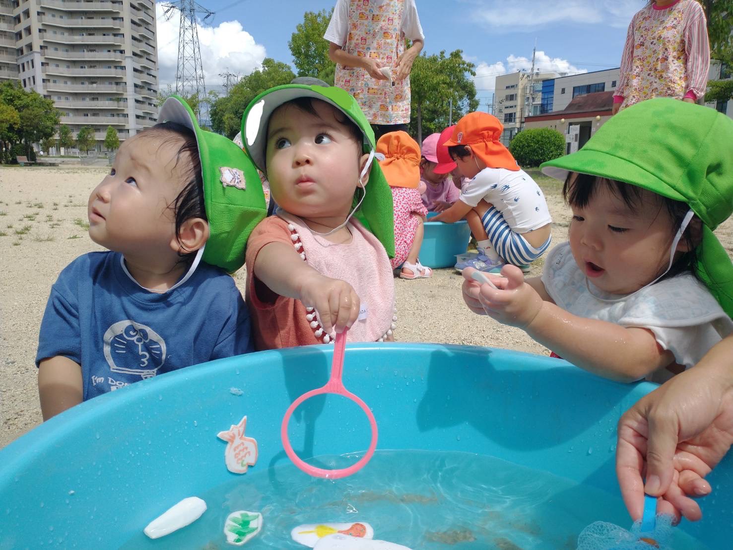 8月28日、月曜日 おひさまひろばで、水遊びをしました。 お魚すくいをしたり、氷に触れました。 丸い氷や牛乳パックの氷、ペットボトルの氷、 ボウルの氷…いろいろな氷があって水遊びがより楽しくなりました。 「つめたーい!」と言って氷をさわる子ど...