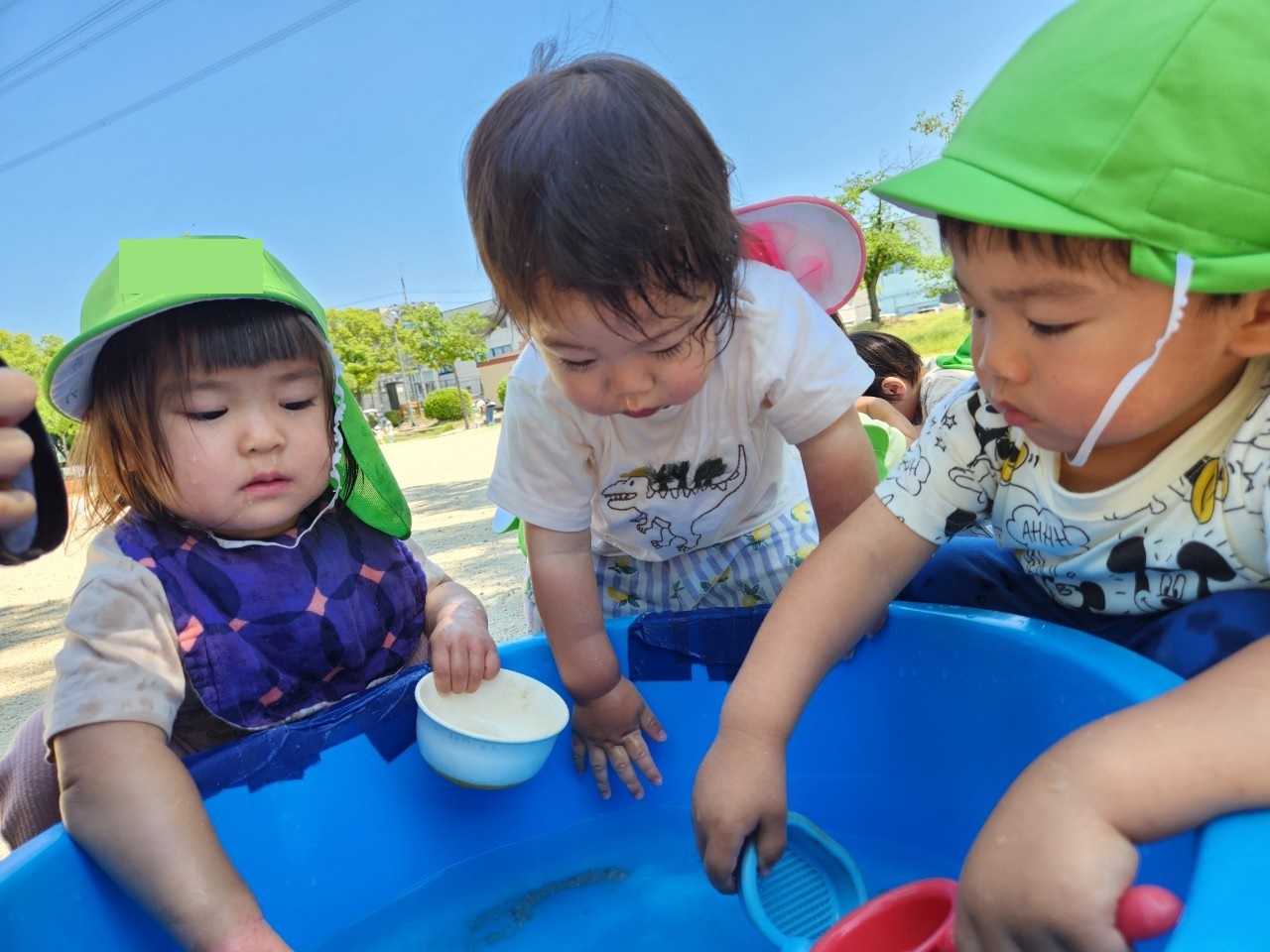 6月14日 12日、14日と2日間、暑くなってきたので、あおむしさんとうずらさんは木陰で氷に触れたり水遊びを楽しみましたよ! 全身びしょびしょになる子もいましたが、夏ならではの遊びを満喫した子どもたちでした!