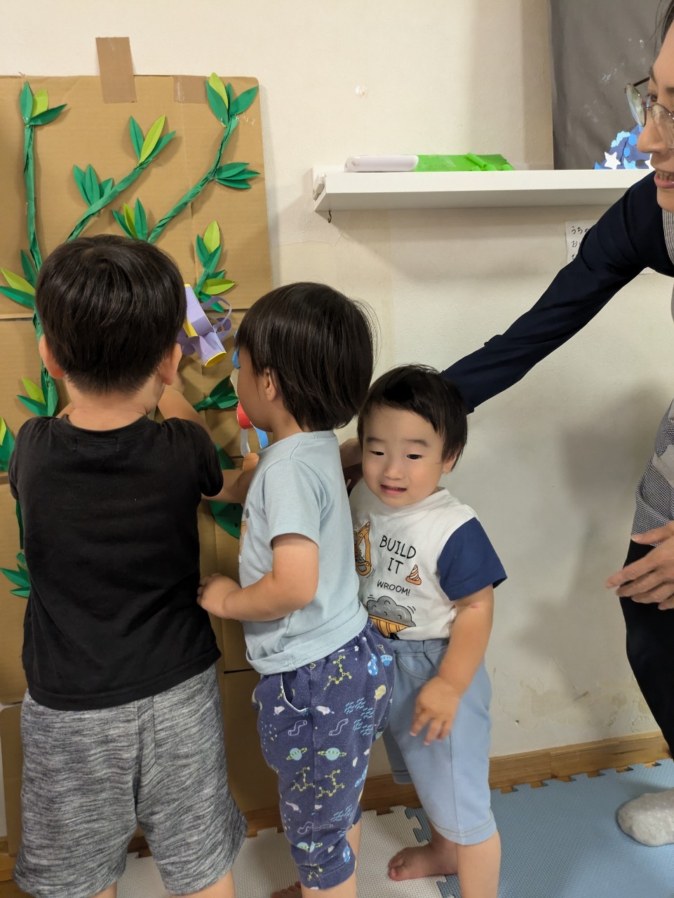 「き~ら~き~ら~ひ~か~る~」キラキラ流れ星がぽこぽこほいくえんにきた!! 天の川の上のひこぼしさまとおりひめさまを見ながら、目をキラキラさせてお話を聞く子どもたち✨ 七夕飾りにはいろんな意味があるんだよ~! と聞きながらぽこぽこの笹の葉... -