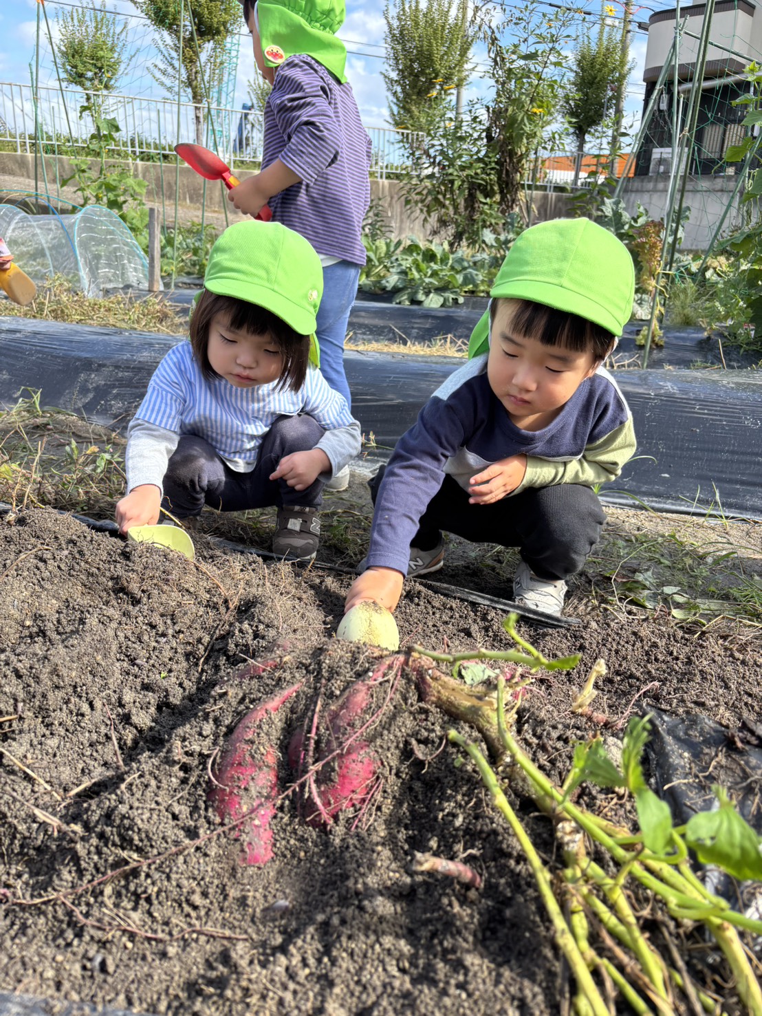 今日はみん里さんと一緒に、くずはシティファームでいもほりをしてきました。バスに乗るのも芋ほりもとても楽しみにしていた子ども達。みんなで長いつるを「うんとこしょ~どっこいしょ~」と一生懸命ひっぱります。 おいもどこにあるかな~ 掘るたびにい... -