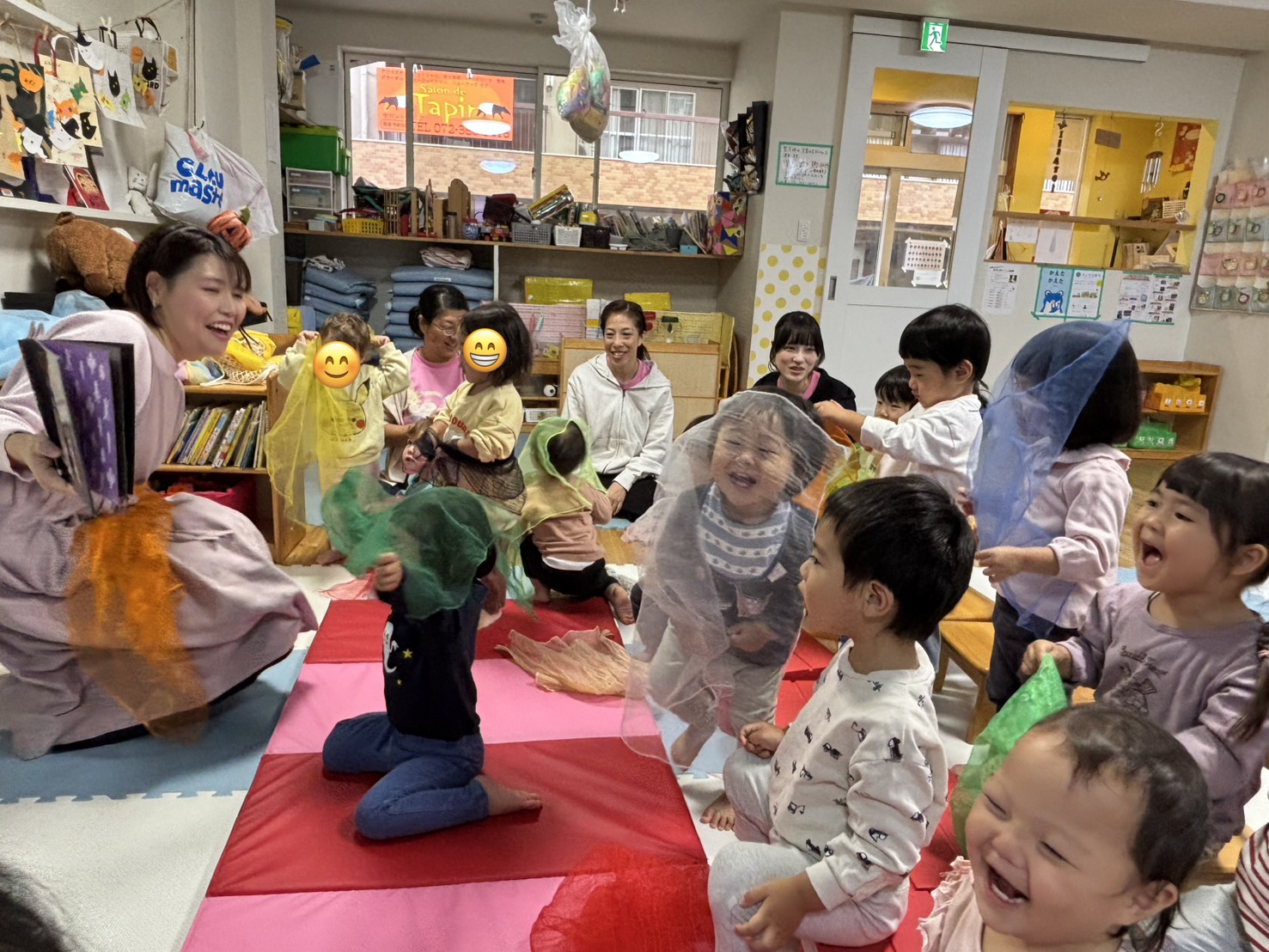10月の絵本のひろばもたくさんの絵本にふれました。 ハロウィンのペープサート…誰が隠れているのかじっと見ています。 絵本を見ながら、シフォン布でいろいろなおばけに変身~ お友達と一緒に… ばぁ!! 絵本の中のおばけを探し始めると、みんな少しずつ... -