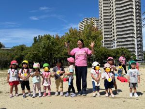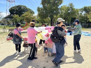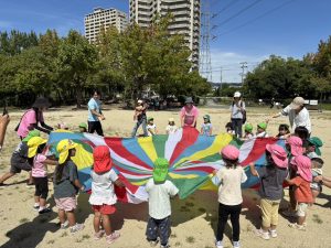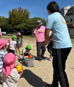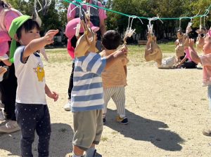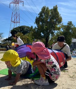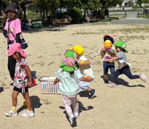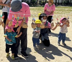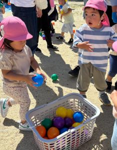 今日のおひさまひろばは運動会でした。地域のお友達と一緒に、たくさん体を動かして遊びました。最初は9月生まれのお友達のお誕生会をしました。