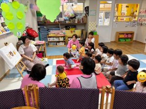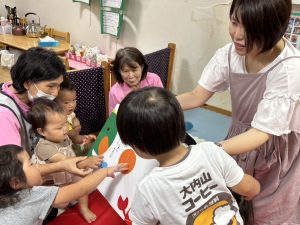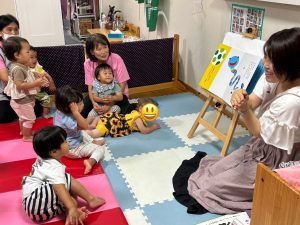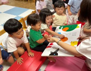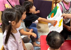 朝晩涼しくなって過ごしやすくなってきましたね。公園で遊ぶ時間が長くなってきて、子ども達も毎日楽しそうに遊んでいます。今月の絵本のひろばでは、季節の歌や絵本をたくさん読んでもらいました。「こぶた たぬき きつね ねこ」のパネルシアターでは、体の向きが変わったり、アレンジされた歌に笑いがとまらないそらまめくん達。みんなよく見ていました。