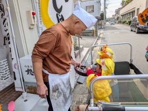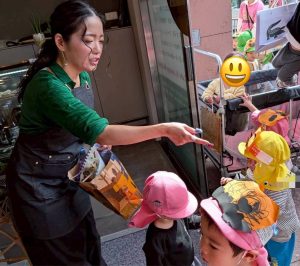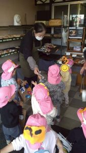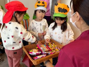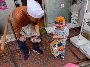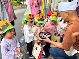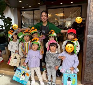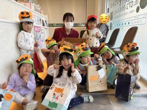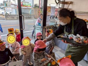 先日の雨で行けなかったハロウィンウォーク2日目いってきました。かぼちゃのおばけに変身して出発❣ まずは、あおむしくんとうずらちゃんで、美味しいパン屋さん「うずしお」さんへ!魔法の言葉は?トリックオアトリート‼お菓子をくれなきゃいたずらしちゃうよ!