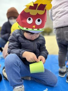少しづつ慣れてきて、一緒に追いかけ玉入れやオニのパンツを踊りました。
