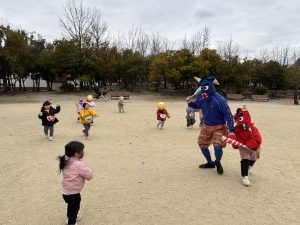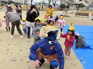みん里の幼児さん達は豆を投げながらオニさんと追いかけっこ。まてまて~