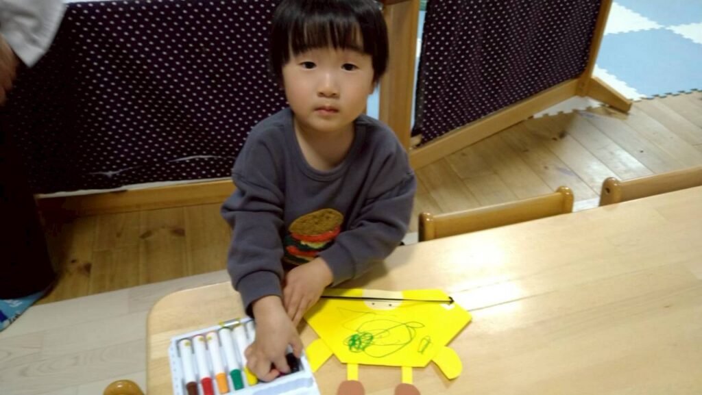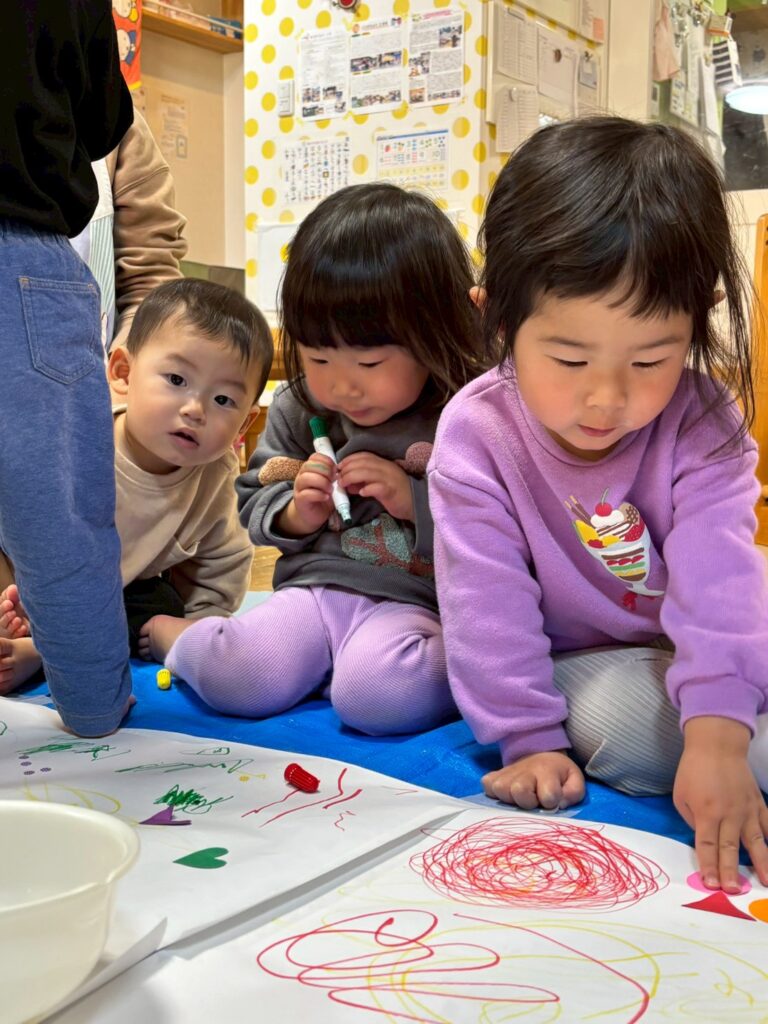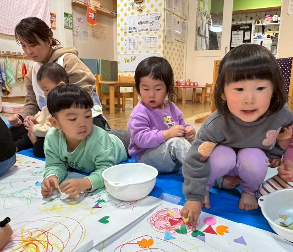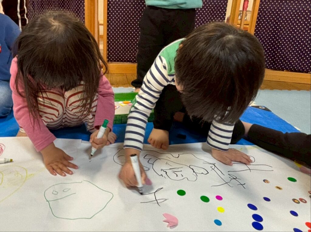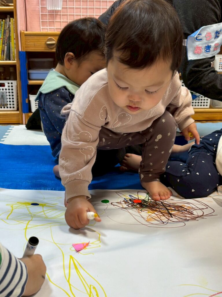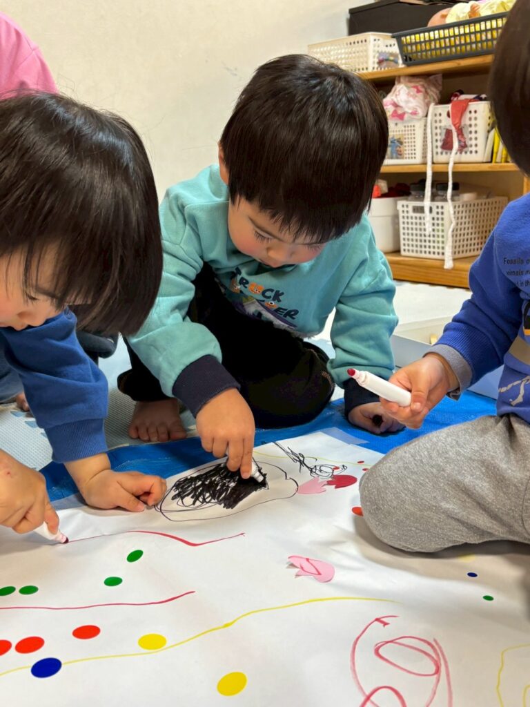 大きな模造紙に思い思いの方法で柄をつけていき、おおきなぼうしにデザインしました!!