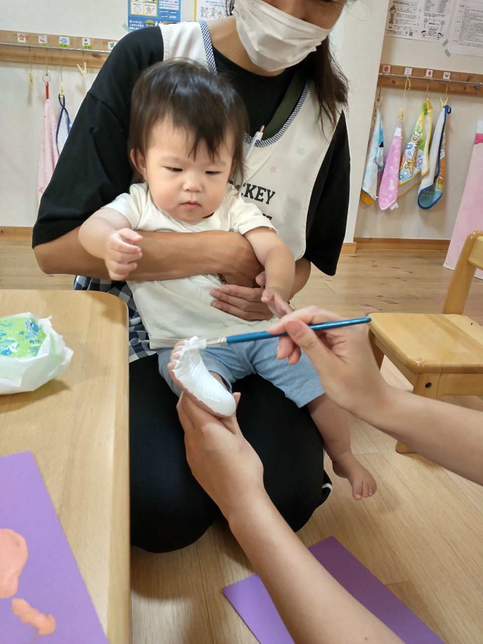 あおむしくんの、えのぐ製作! 手型、足型アートをしましたよ。 絵の具をつける時は、くすぐったいのか、指先をきゅっとまげたり 真剣な表情をしたりと、いろいろな姿を見せてくれます! みんな上手にぺったんできまし...