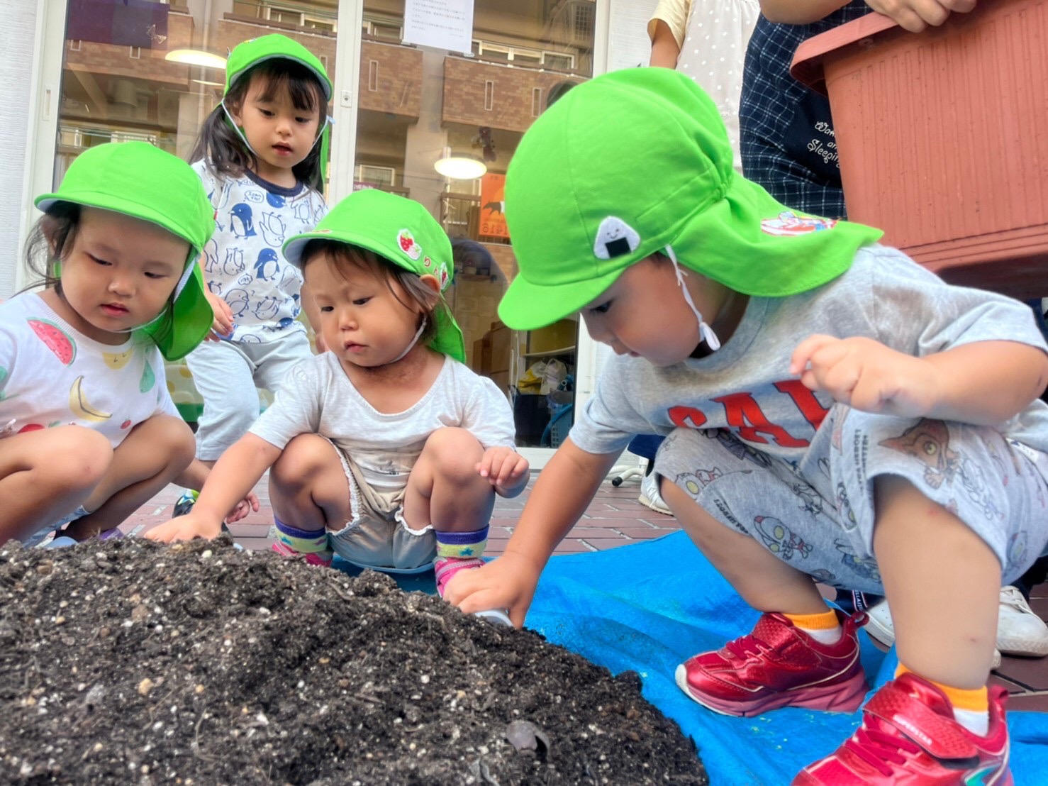 芽キャベツを植えました。 土をプランターに、よいしょ、よいしょ… みんなで土のベット作り。 コップで穴をあけて植えました。 どんな風になるのかな… おおきくなあれ~♪ -