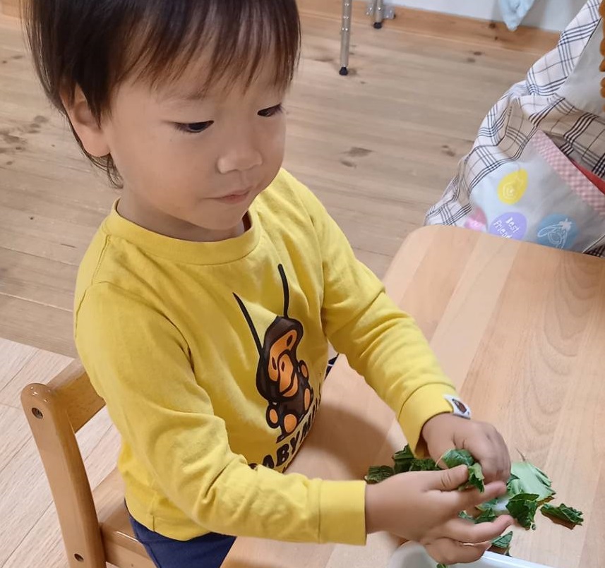 11月22日 朝早く来たメンバーで、今日の給食「八宝菜」に使う白菜とチンゲン菜をちぎりました。 あおむしさんが食べているみたいに、と聞くと一層やる気を見せる子どもたち…。 一生懸命野菜ちぎりをしてくれました。 -