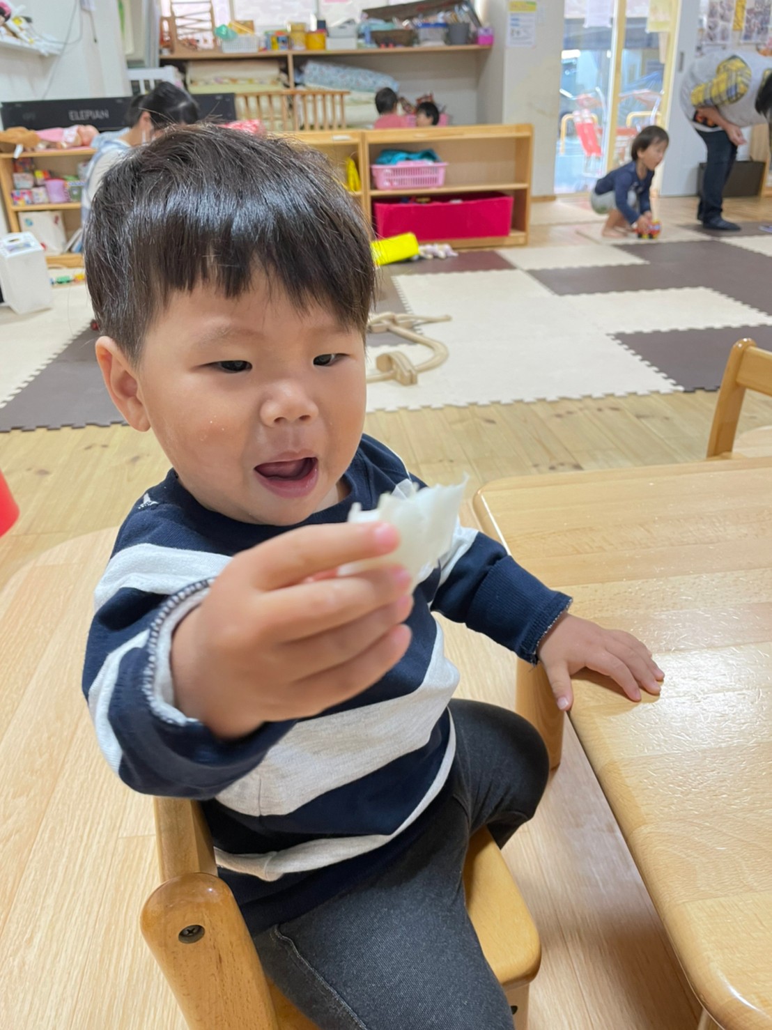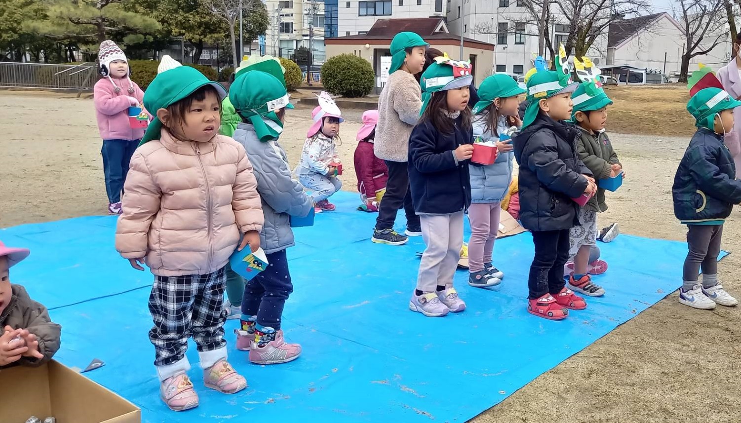 1月24日 今日はおひさまひろばに参加しました。 鬼の顔の豆ますを作って鬼が来る時に備えます…。 いざ、鬼がやってくると皆ドキドキのお顔。 怖くて泣いてしまう子や、負けずに立ち向かって豆をたくさん投げる子もいました。 -