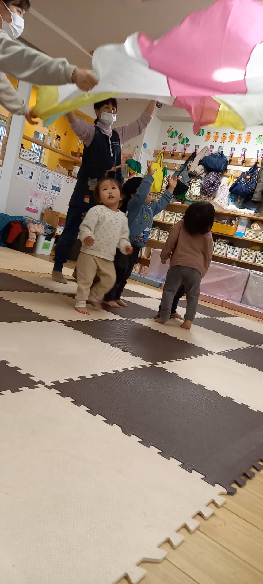 1月11日 雨のため、お部屋遊びを楽しみました。 パラバルーンを上げたり下げたり…子どもたちが中に入って大興奮の様子でした。 あおむしさん、うずらさんが中に入り、そらまめさんが保育者と一緒にパラバルーンを動かしてくれていました。 -