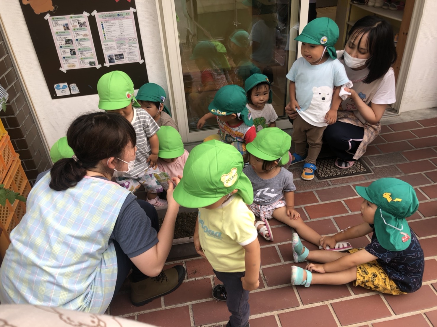 6月29日 あさがおの種を一人一つずつもらい、植えました。 土のお布団ををかけて… 「おやすみ~」「ねんねだね~」 と言って土をかけていきました。 そらまめさんはお水もあげました。 芽が出てくる日が楽しみですね! -