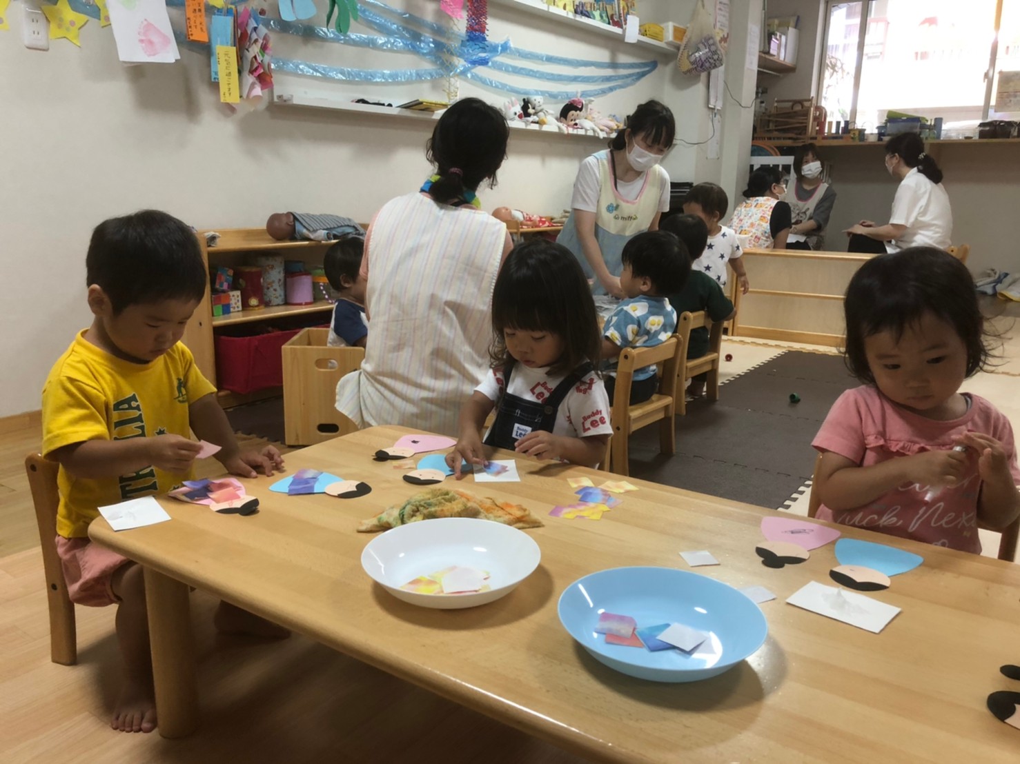 7月5日 七夕制作をしました。 おりひめさま、ひこぼしさまを作ったり、すいかやきゅうりを作りました。 一人ひとり集中して作っている様子がうかがえます…! -