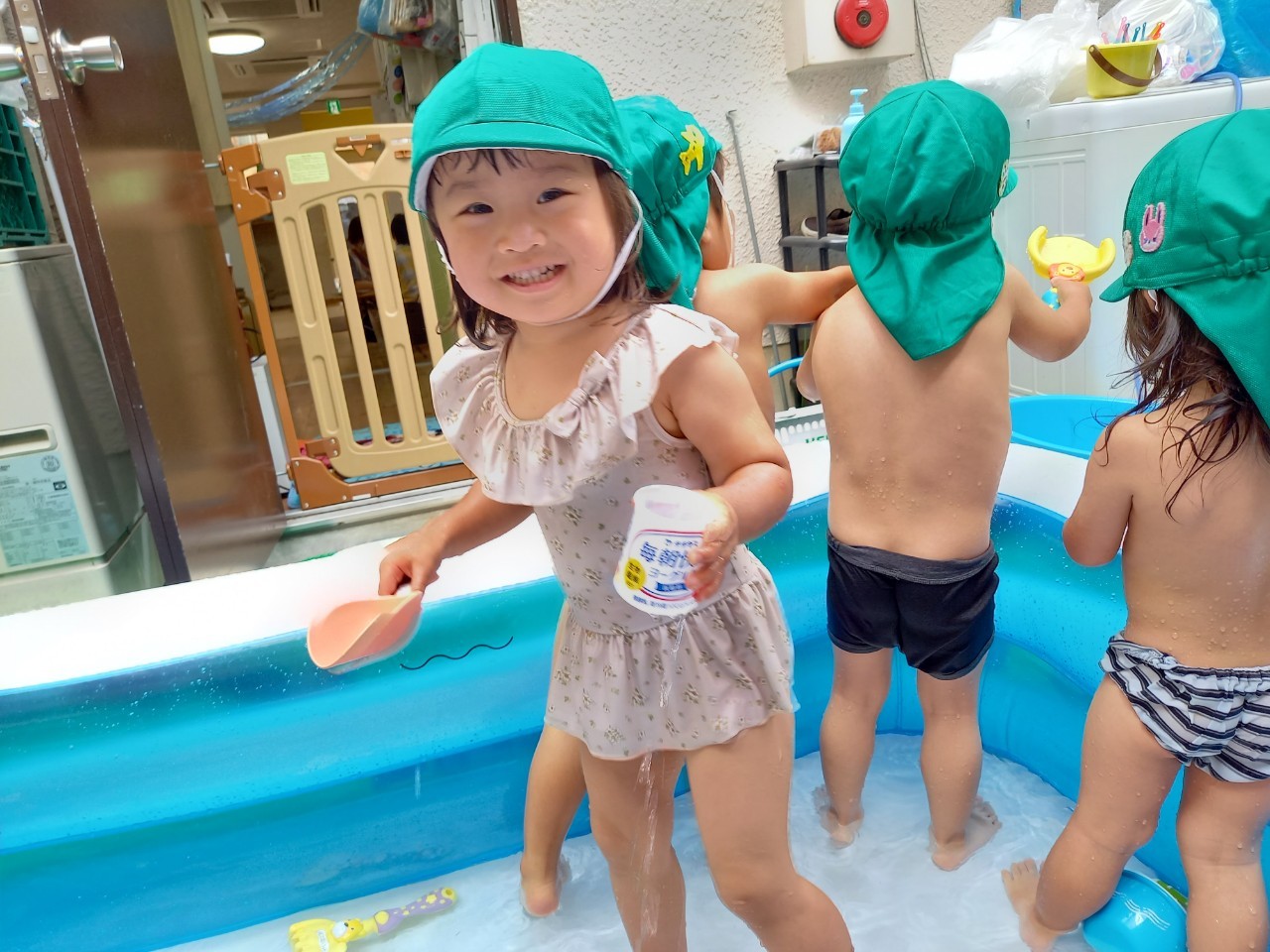 7月5日 今年初めての水遊びをしました。 とりあえずかぶってみる…! お水をじゃぁ~!! 「きゃ~!!雨だぁ~~~!!!」 -