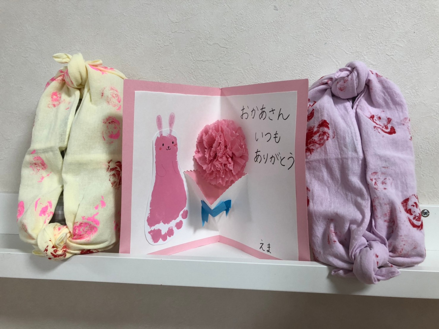 今週は母の日製作をしました。 小松菜の茎を使い、赤やピンクの絵の具を付けて好きな色の布にぽんぽんスタンプしています。きれいなお花の模様が浮かび上がってきました! 保育者の手の動きをまじまじと見つめて真似してみる様子も見られます。 &nb... -