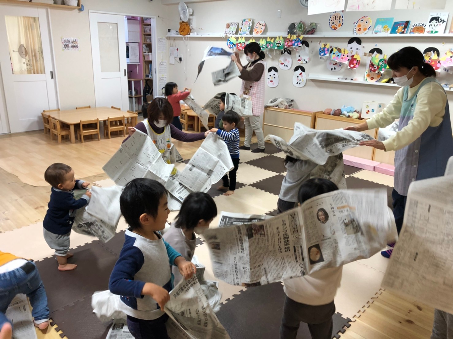 今日は新聞遊びをしました。 大きな新聞紙を、バサバサ音をならしながら一生懸命広げています。 隠れていないいないばあ! あれ?寝てるお友だちが… トントン… ぎゅっと握りしめたり、やぶったり、真剣です。 服と冠を作ってもらったよ。 女の子達はお姫様... -