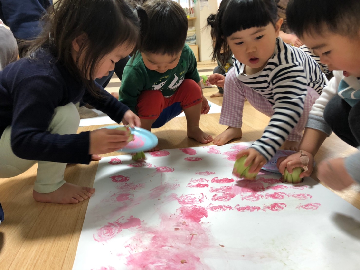 今日は野菜スタンプと絵の具使ってさくらの花を表現しました🌸 赤と白を混ぜて子ども達に何色になるかな~とまぜまぜすると… ぴんくになった~(*^^*)といきいきとした声で答えてくれました。 使う野菜はチンゲン菜と小松菜の根っこ部分。 大きな根っこはそ... -