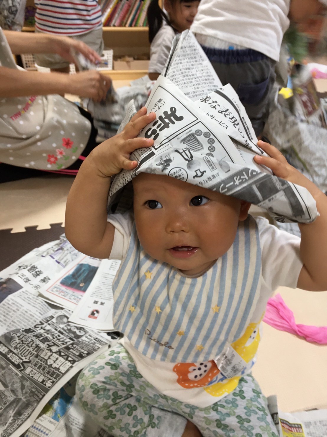 今日は新聞あそびをしました。 広げるとみんなの体が隠れる位の大きい新聞紙。 お布団のように上にかけたり、いないいないばあ!とお友だちとしたり、みんなどんな風に遊ぼうか夢中になって考えています。 小さいお友達は、ひっぱってもらって大喜び! 時...