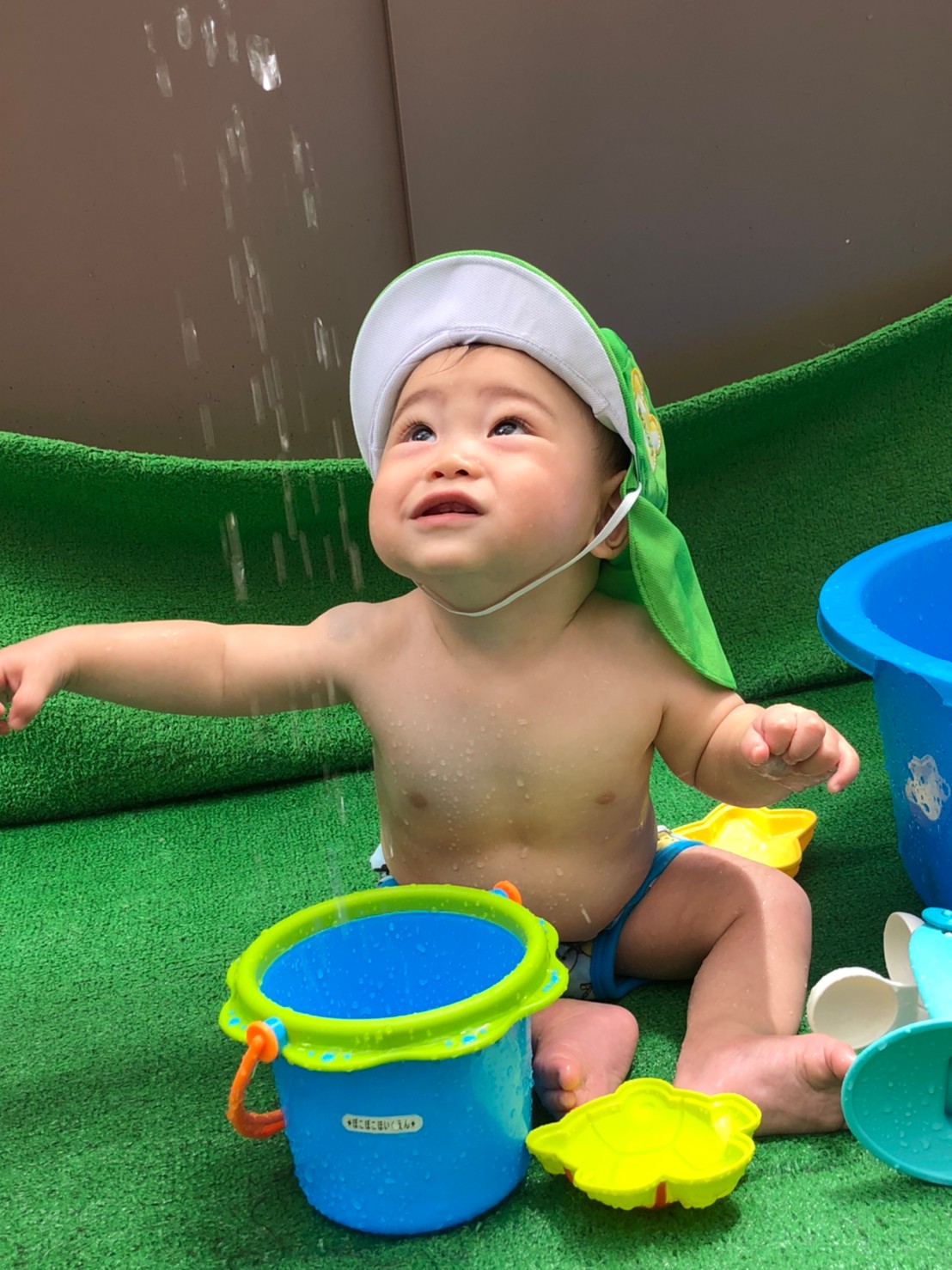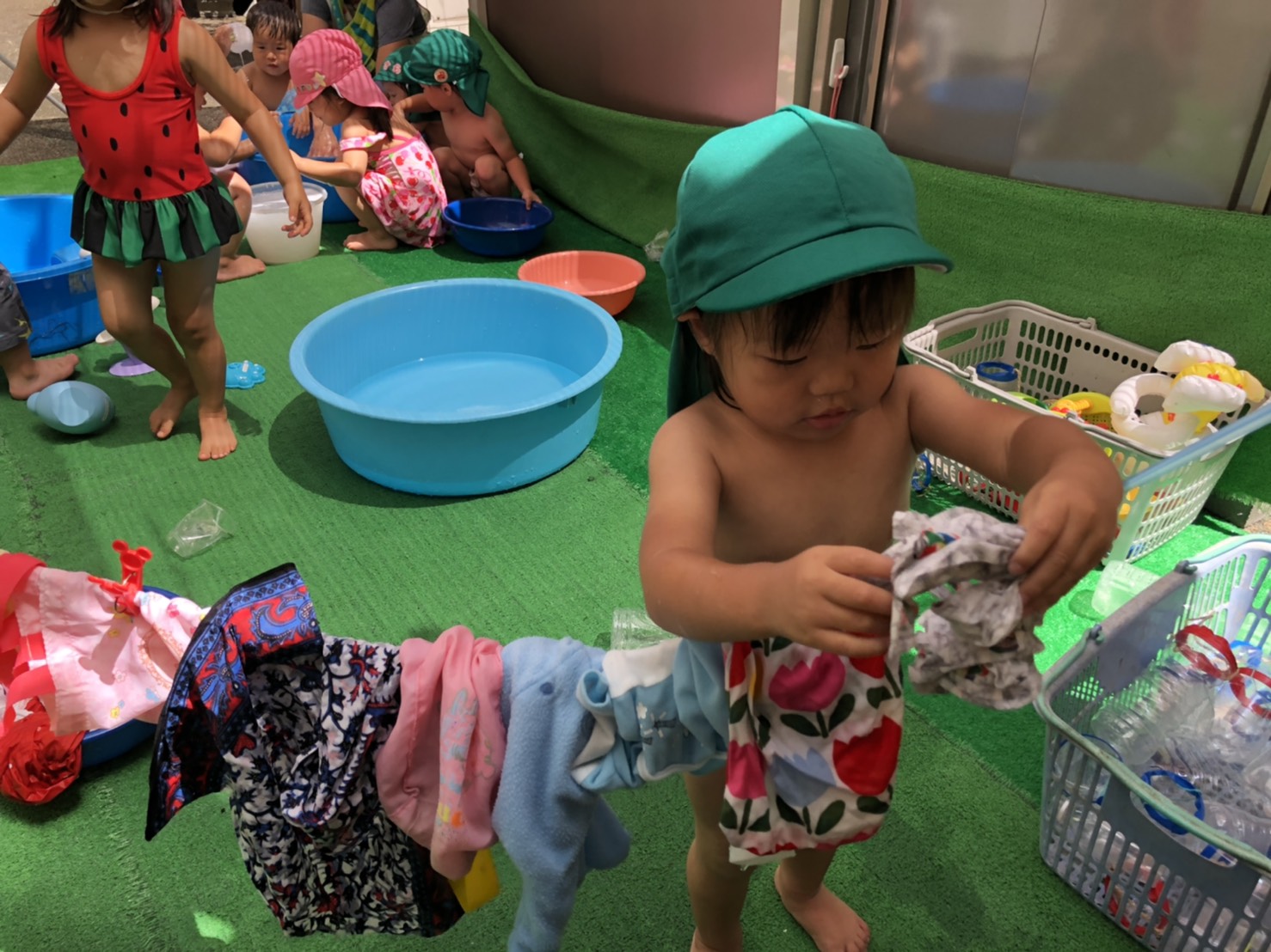 梅雨の晴れ間のような今日はいい天気。あおむしくん、うずらちゃんはパンツ。そらまめくんは水着に着替えて順番に少人数で水遊びを楽しみました。 あおむしくん洗面器の水をたたいてはねかえってくるお水に大喜び♪水の感触を楽しんでます。 うずらちゃんは... -