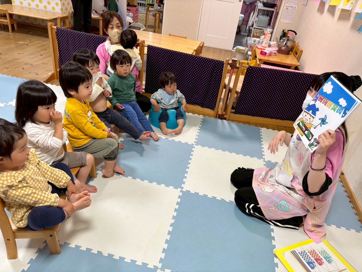 今日はえほんのひろばがありました☺ 初めてでしたがみんな落ち着いていてとっても静かな環境でひろばが行われました✨ とっても楽しんでくれています♡ えほんのひろばでは、絵本を読むだけでなく絵本から飛び出してこんな風に遊んだりもします♪ ちょうちょ... -