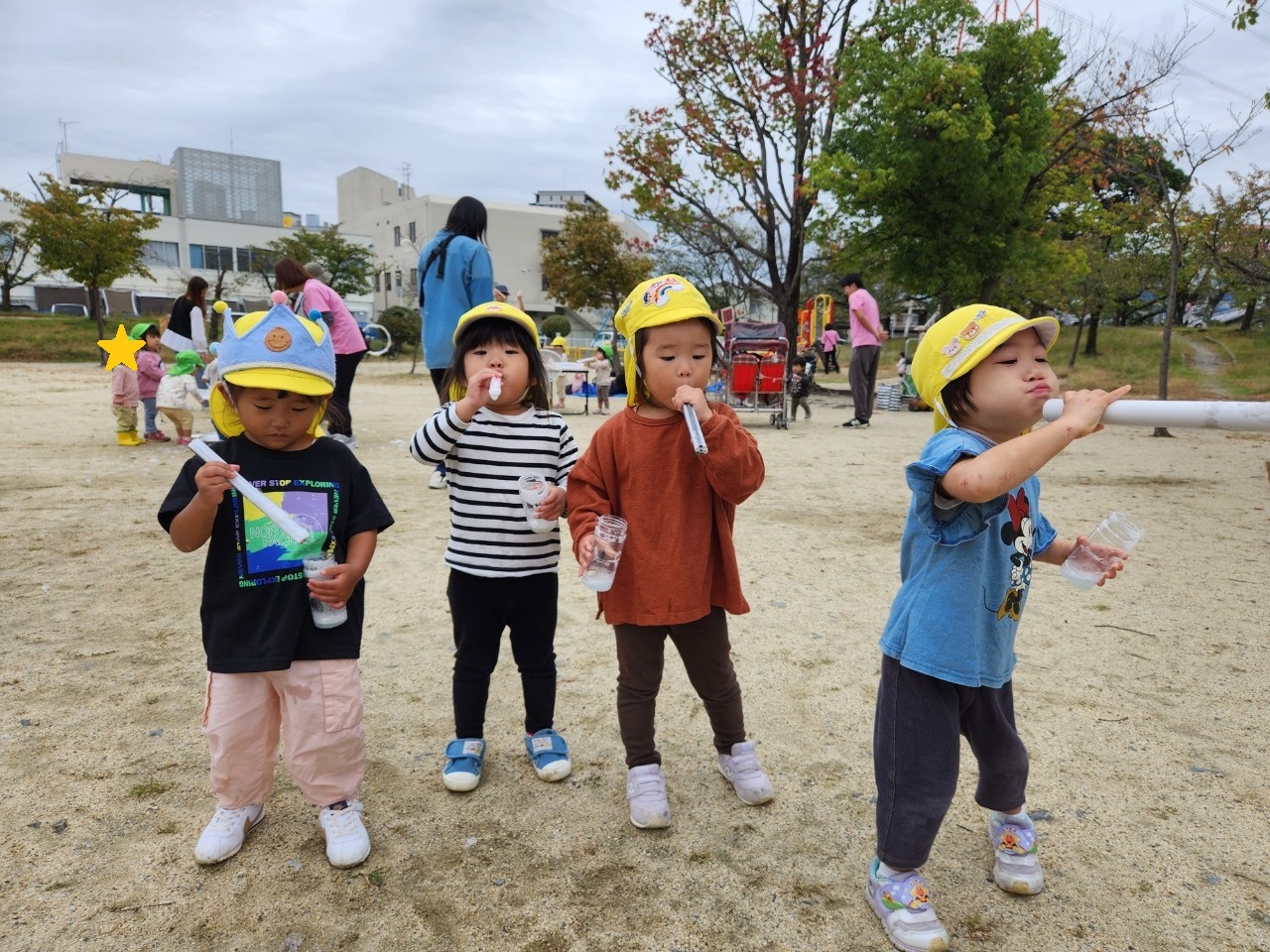 10月29日 おひさまひろばでしゃぼん玉遊びをしました。 そらまめさんはふーっと上手に息を吹きかけしゃぼん玉を作っていましたよ。 うずらちゃん、あおむしくんもうちわなどを使い、ぱたぱた振って出てきたしゃぼん玉に大興奮でした。 -
