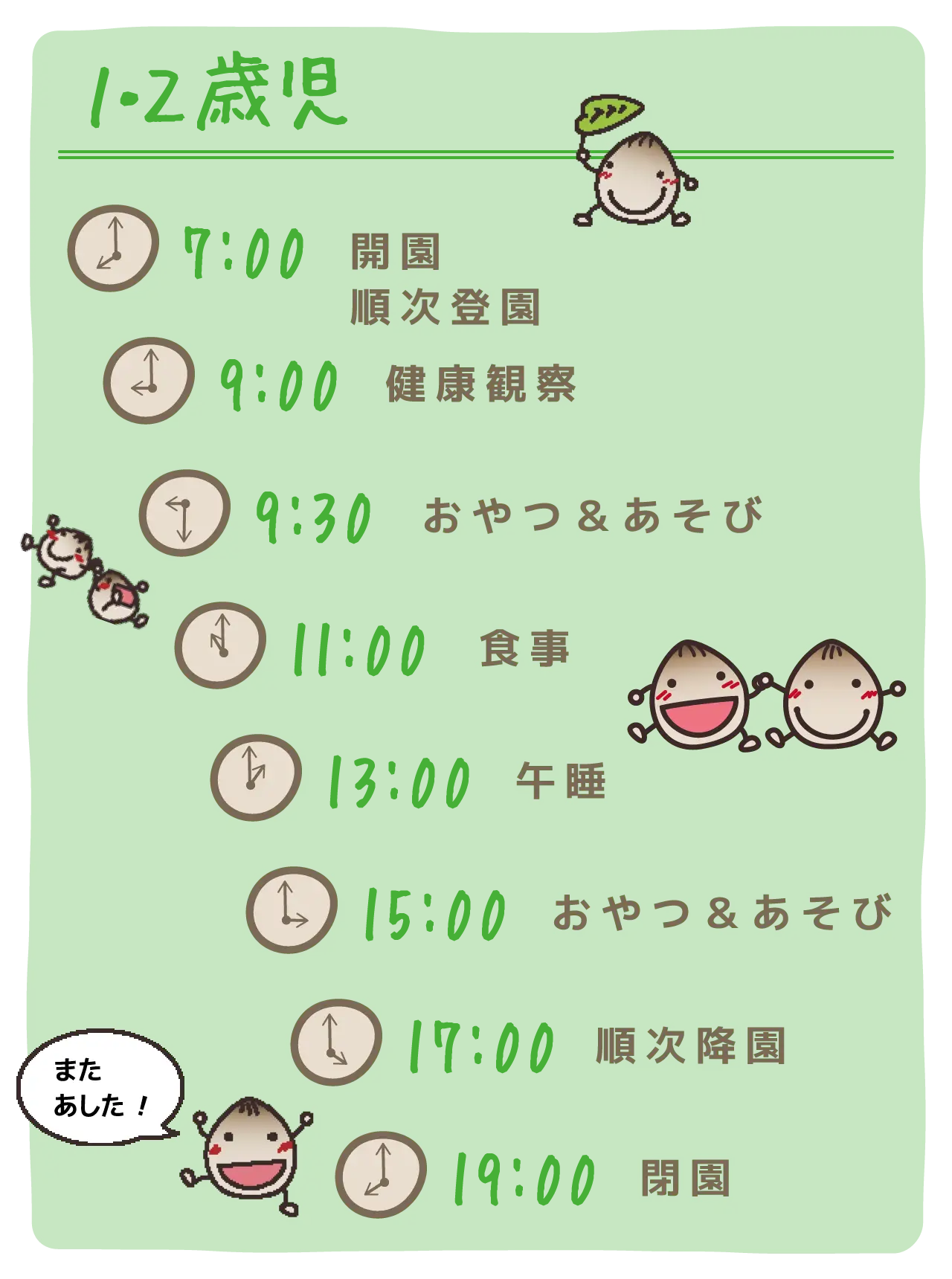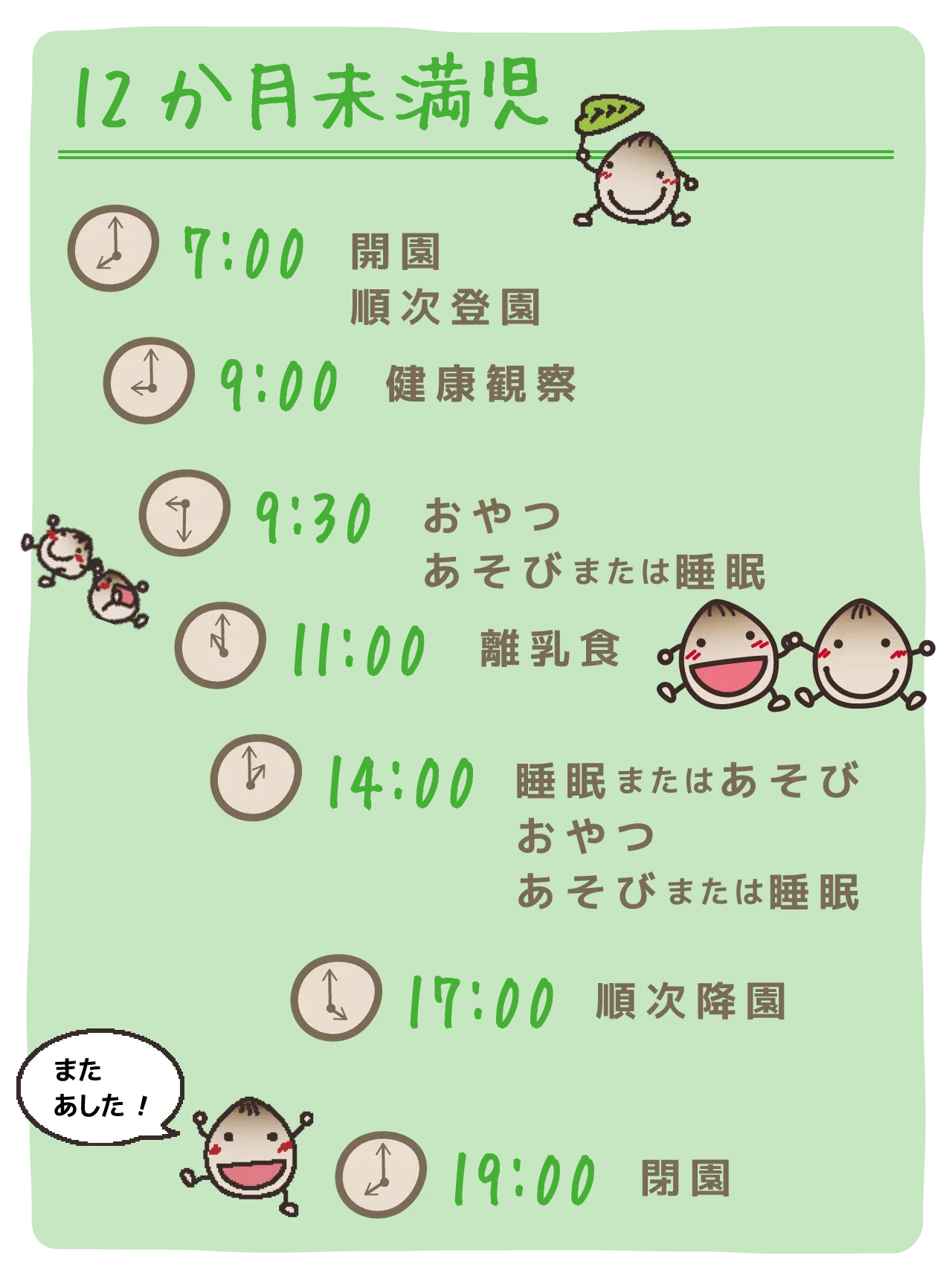 ※ 排せつやオムツ交換は月齢やひとりひとりの発達に応じて随時行います。